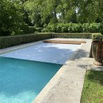 Volet de piscine plage immergée avec lames couleur vanille, se déroulant dans la piscine, photographié en plein jour à Arles.